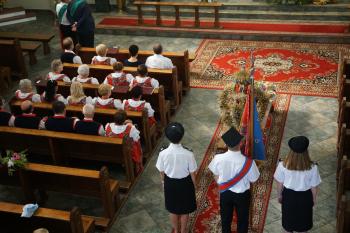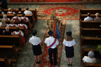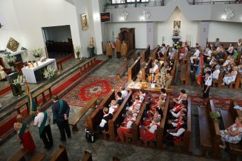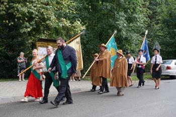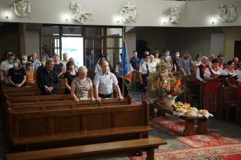 Koło Gospodyń Wiejskich, poczty sztandarowe oraz liczna grupa mieszkańców Grojca przybyli do parafii Matki Bożej Ostrobramskiej w Grojcu, by pod przewodnictwem proboszcza ks. Józefa Zborka uczestniczyć we mszy św. dożynkowej i podziękować Bogu za zebrane w tym roku plony. Z mieszkańcami modlił się też wójt gminy, Mirosław Smolarek z małżonką.