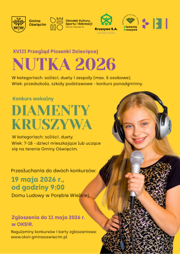 Równolegle, w dniu 19 maja br., od 9:00 odbędą się również przesłuchania do konkursu wokalnego dla dzieci i młodzieży „Diamenty Kruszywa”, którego organizatorem są Krakowskie Zakłady Eksploatacji Kruszywa S.A., a gmina Oświęcim jest jednym z pomiotów wspierających.