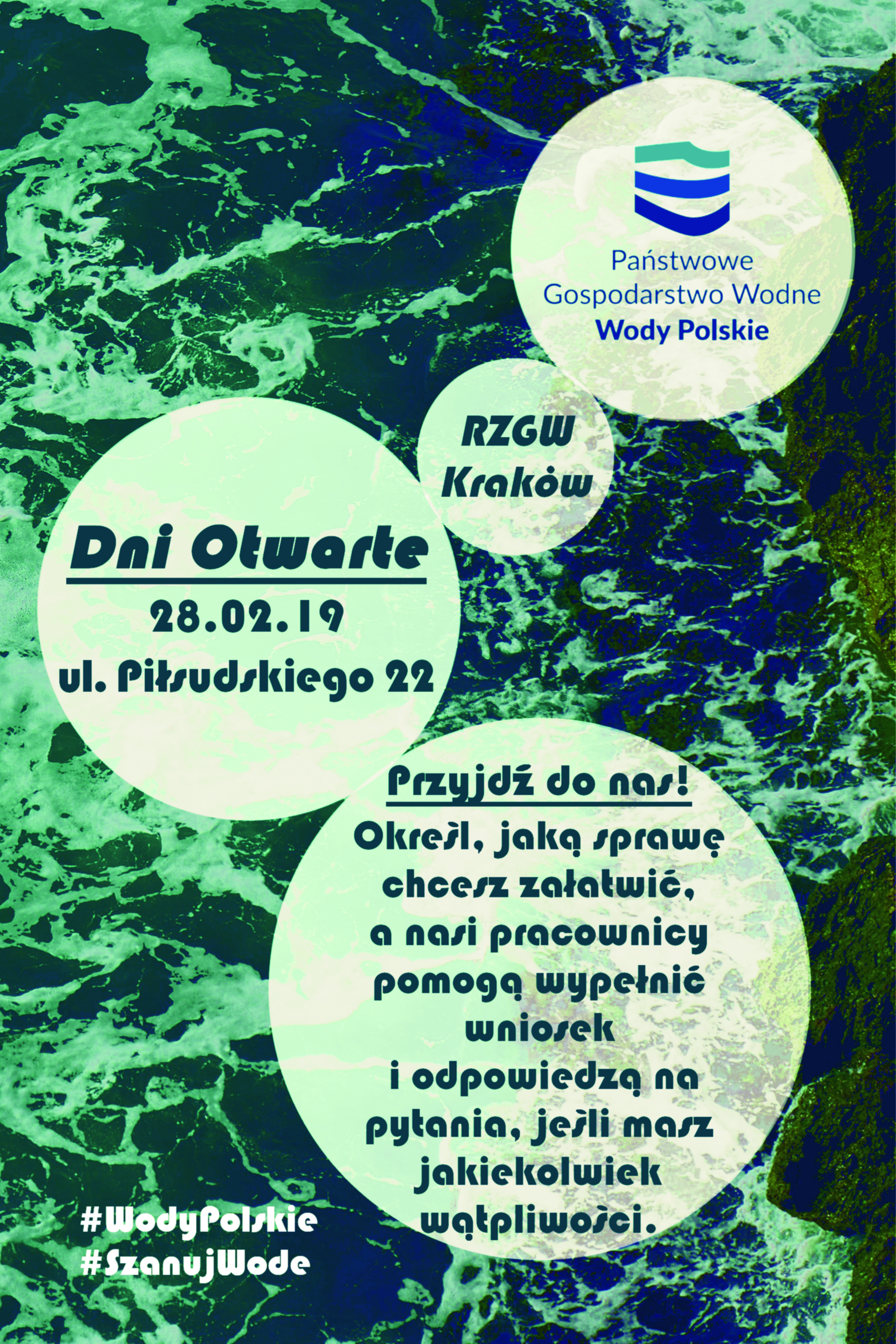 Państwowe Gospodarstwo Wodne Wody Polskie Regionalny Zarząd Gospodarki Wodnej w Krakowie zaprasza do udziału w Dniach Otwartych. W każdy ostatni czwartek miesiąca, w godzinach od 8.00 do 14.00 nasi pracownicy będą udzielać wszelkich informacji oraz porad związanych z gospodarką wodną - odpowiedzą na Państwa pytania, pomogą wypełnić wniosek, sprawdzą niezbędną dokumentację.