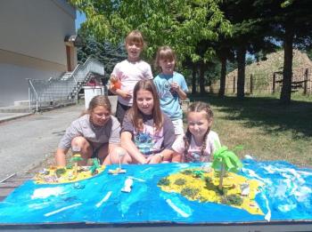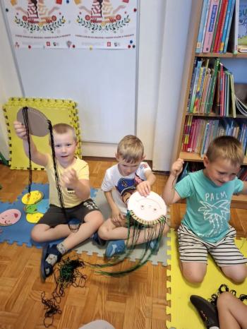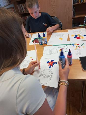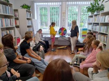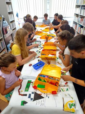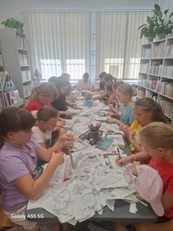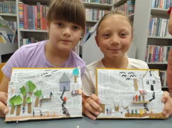W bibliotece w Grojcu rozpoczęliśmy wakacje od tworzenia kolorowych łapaczy słońca, które rozświetliły niejedno dziecięce okno. W kolejnych dniach dzieci ożywiały zużyte książki, tworząc z ich stron trójwymiarowe krajobrazy. Pojawiła się też makieta z rzeką i elementami z klocków LEGO – domy, mosty, fantastyczne postaci i roślinność. Na zakończenie wakacji odbyły się gry i zabawy rozwijające logiczne myślenie: kalambury, tangramy, Koło Fortuny i zabawy z kostkami Story Cubes.
