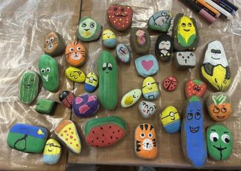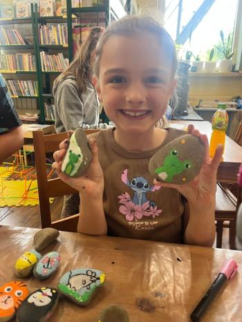 We Włosienicy uczestnicy warsztatów tworzyli kolaże i fantazyjne konstrukcje z rurek. Podczas kolejnych spotkań dzieci zamieniały zwykłe kamienie w małe dzieła sztuki – biedronki, pizze, owoce i zwierzęta. Każdy kamyk stał się małą wizytówką naszej biblioteki, gotową wyruszyć w wakacyjną podróż po Polsce.
