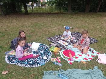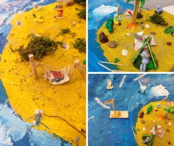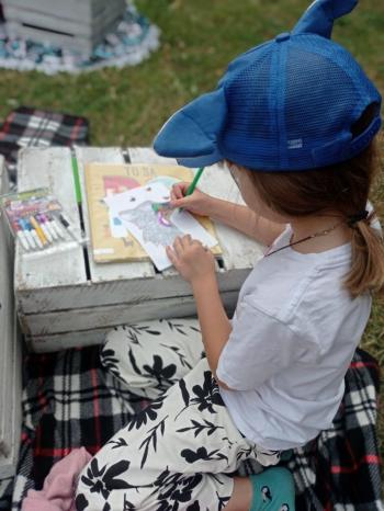 W Porębie Wielkiej dzieci stworzyły makietę bezludnej wyspy pełnej egzotycznych zwierząt, palm i przygód. Nie zabrakło także literackiego pikniku na trawie – wspólnie czytaliśmy bajki i tworzyliśmy własne historie, zdanie po zdaniu. Dzieci kolorowały także relaksacyjne ilustracje i dzieliły się swoimi pomysłami.