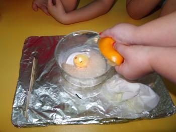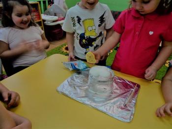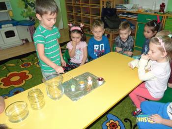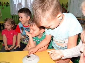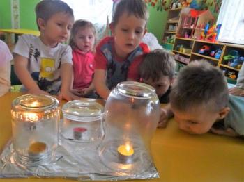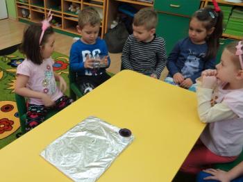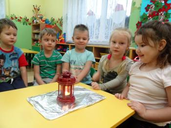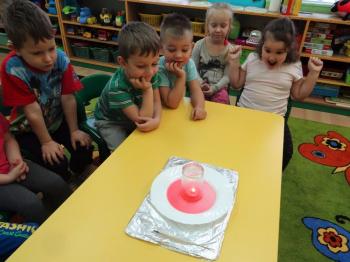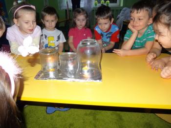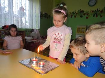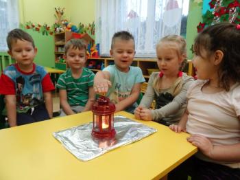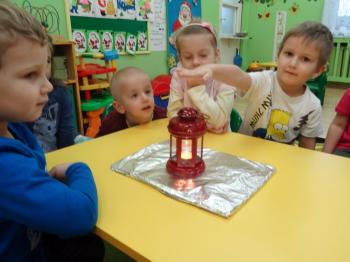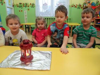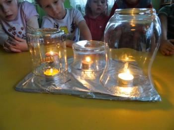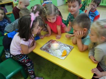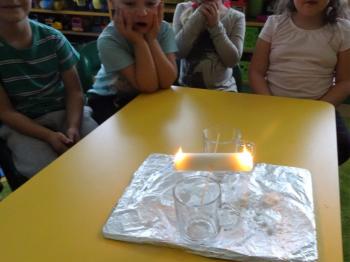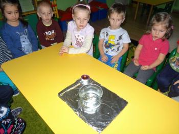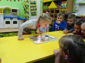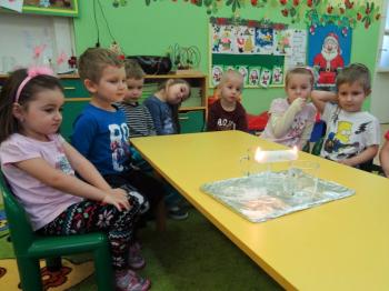 Tematem przewodnim zabaw badawczych i eksperymentów, w których uczestniczyły dzieci z grupy Biedronek 12 grudnia był ogień. Dzieci poznały właściwości ognia, sposoby wykorzystania w życiu codziennym, obserwowały efekt spalania drewna, papieru, dowiedziały się co to jest i jak powstaje sadza. Eksperymenty w których uczestniczyły dzieci to: