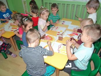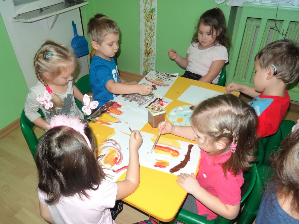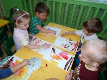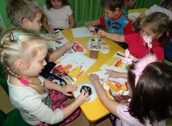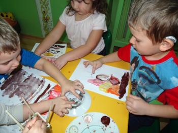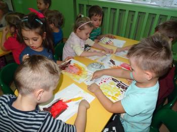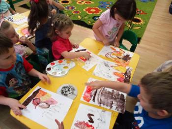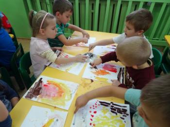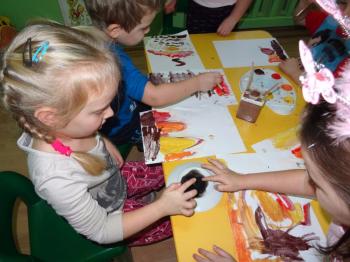 Zakończeniem zajęć była swobodna ekspresja plastyczna na temat: „OGIEŃ”. Dzieci malując farbami przedstawiły swoje wyobrażenie tego zjawiska, a sadzą rysowały dym wijący się nad ogniskiem.