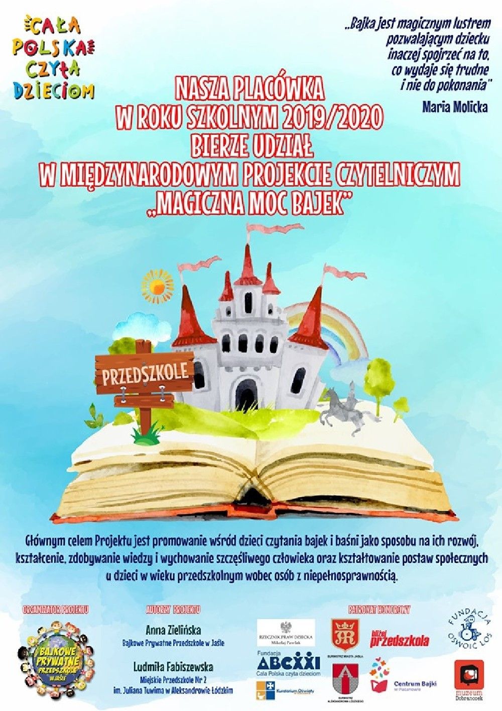 Głównym celem Projektu jest promowanie wśród dzieci czytania bajek i baśni jako sposobu na ich rozwój, kształcenie, zdobywanie wiedzy i wychowanie szczęśliwego człowieka oraz kształtowanie postaw społecznych u dzieci w wieku przedszkolnym wobec osób z niepełnosprawnością.