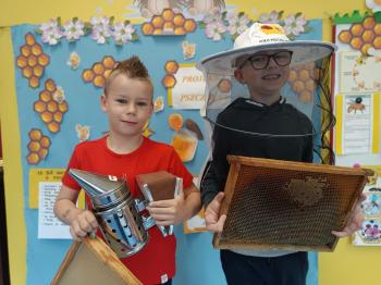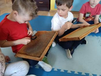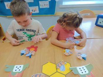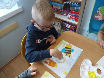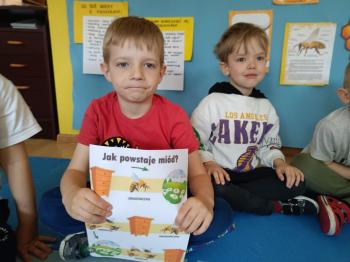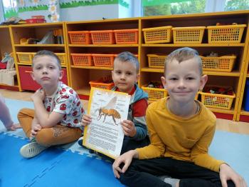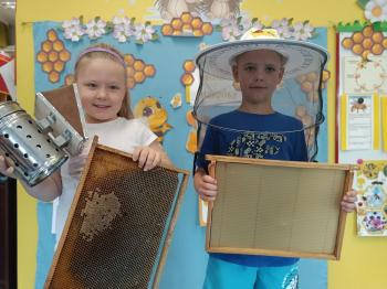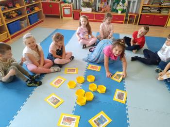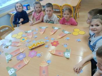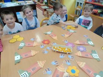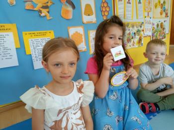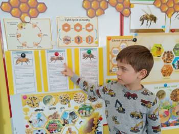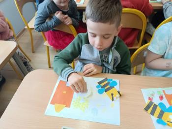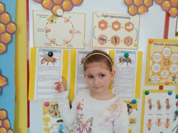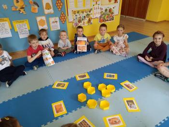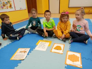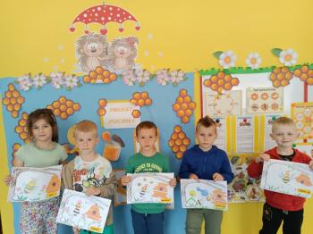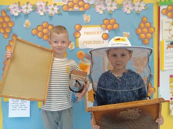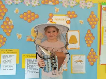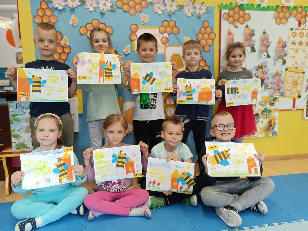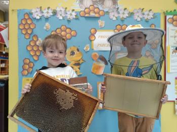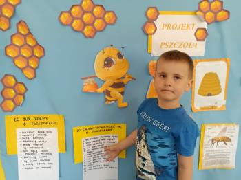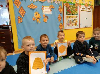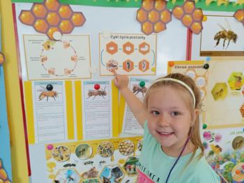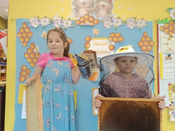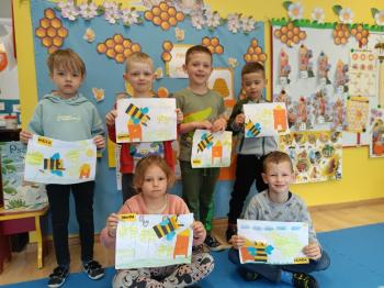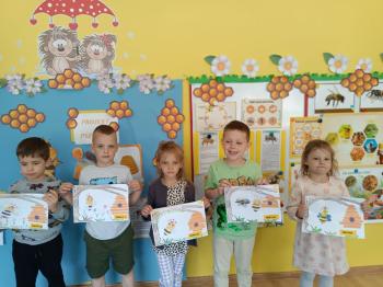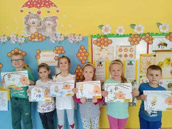 W grupie Jeżyki realizowano projekt edukacyjny "Pszczoła". W trakcie zajęć,l dzieci tworzyły siatkę pojęć na temat tego co wiedzą o pszczołach, ustalały, co chcą się o nich jeszcze dowiedzieć, poznawały nazwy członków "Pszczelej rodziny" (królowa, robotnice, trutnie), brały udział w grach dydaktycznych, wykonywały prace plastyczne tematycznie związane z projektem. Jeżyki miały okazję poznać rożne rodzaje miodu oraz etapy jego powstawania oraz delektowały się różnymi rodzajami miodu. Projekt edukacyjny wzbogaciło spotkanie z ekspertem - pszczelarzem, który wzbogacił wiedzę ciekawostkami.