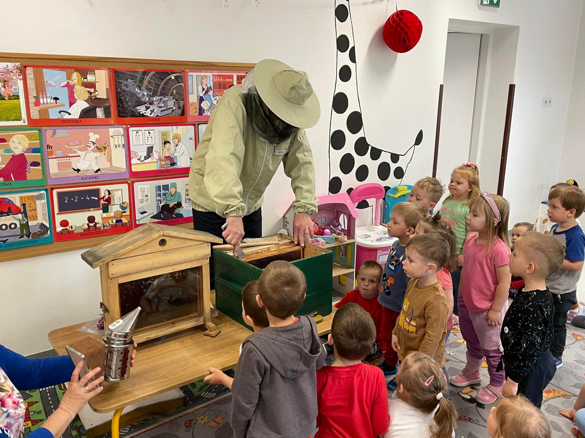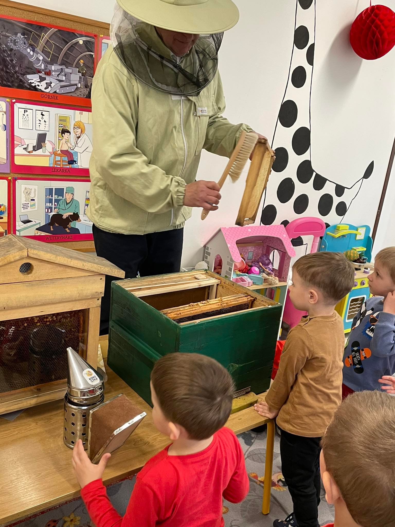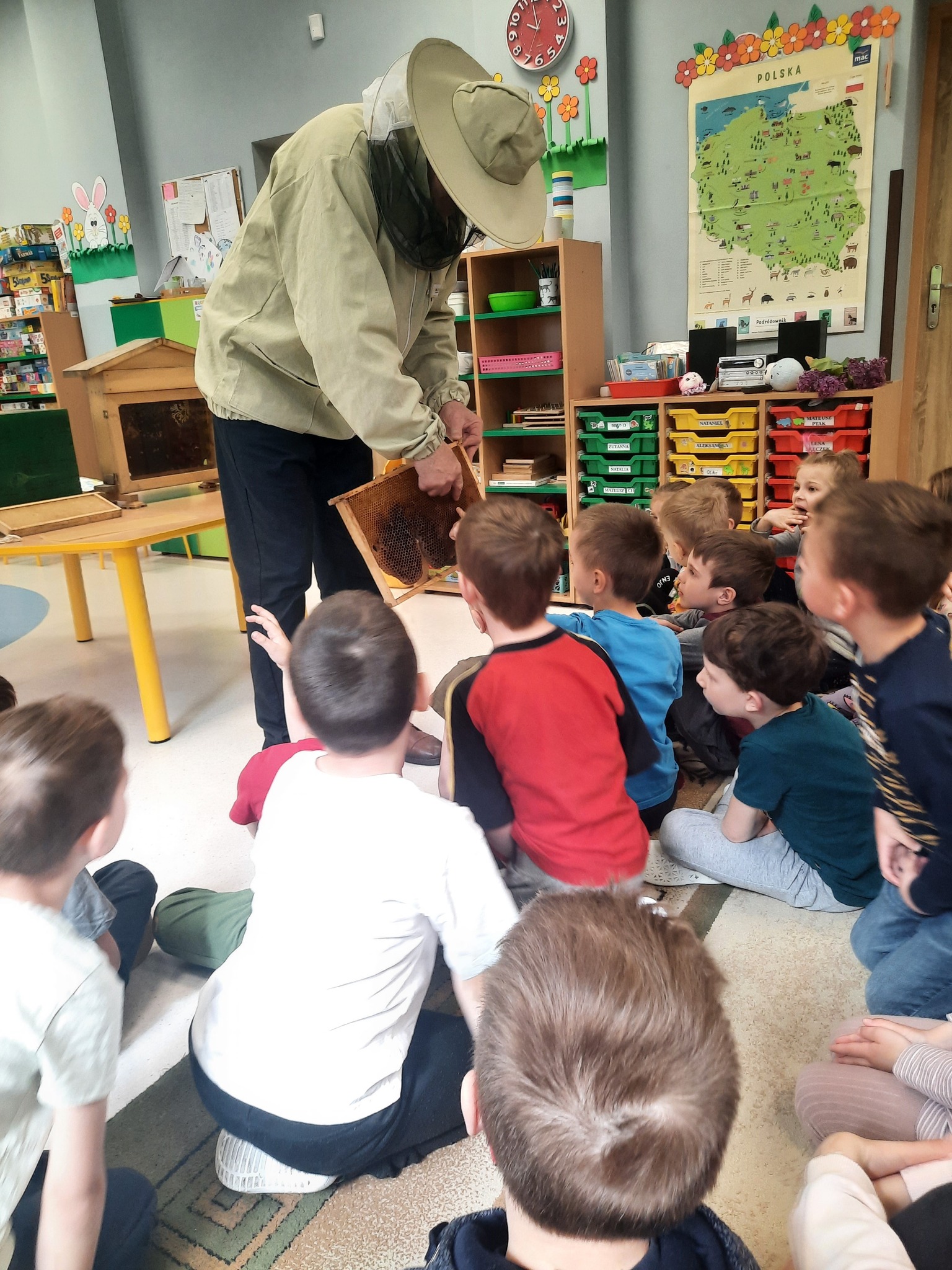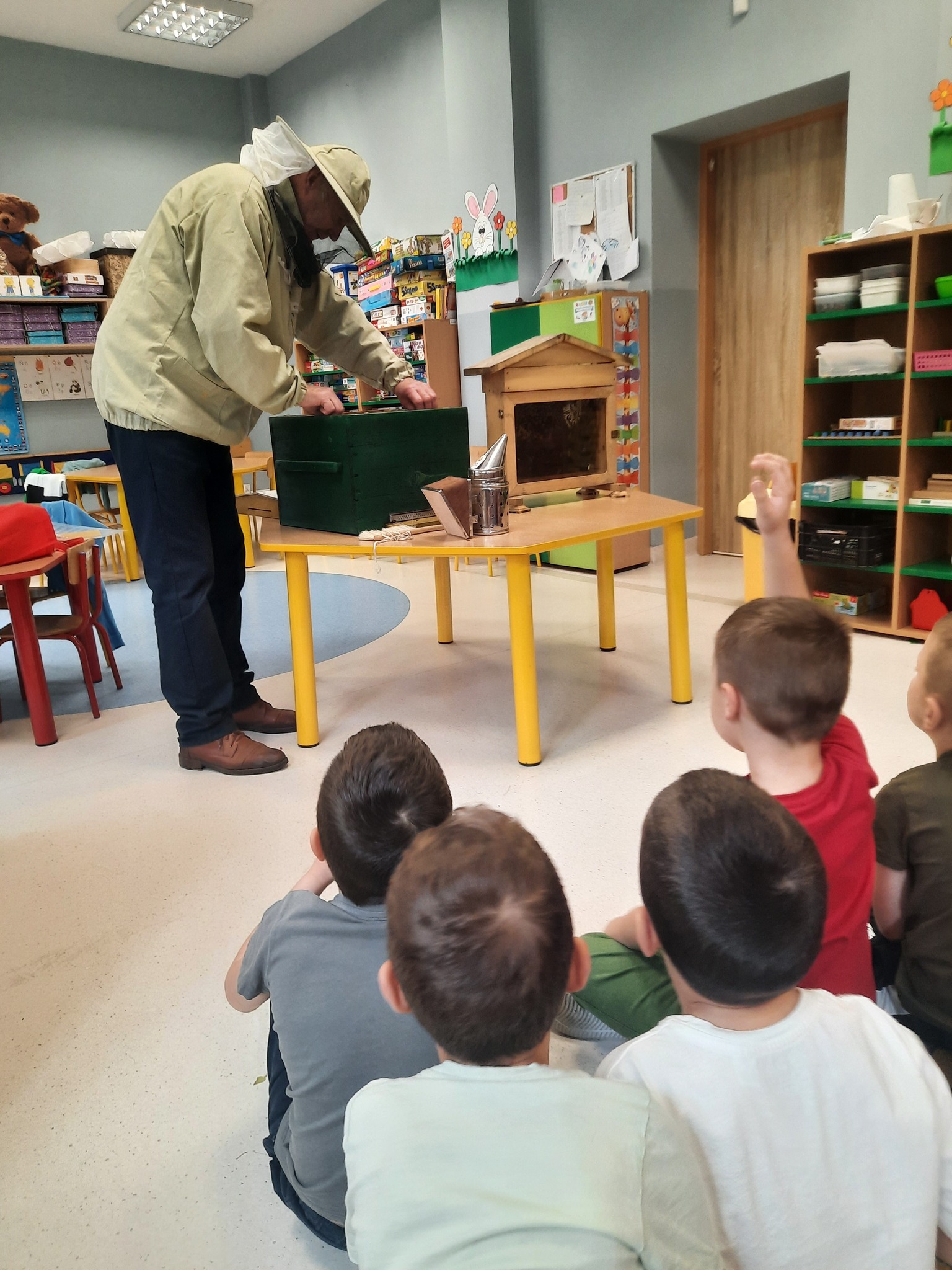 W dniu 8 maja odwiedził nas Pan Rysiu, który jest pszczelarzem i ma własną pasiekę. Opowiedział dzieciom o tym, jak powstaje miód i z czego się go otrzymuje. Opowiadał nam o życiu i zwyczajach pszczół oraz czym się żywią. Dzieci mogły z bliska obserwować plastry miodu, rój pszczół oraz odszukiwały królową. Przedszkolaki mogły także z bliska obejrzeć narzędzia pszczelarza tj. podkurzacz, specjalny kapelusz, dymkę i ramkę. Na zakończenie spotkania dzieci kosztowały andruty z miodem. Dziękujemy serdecznie za miłą wizytę oraz poświęcony czas.