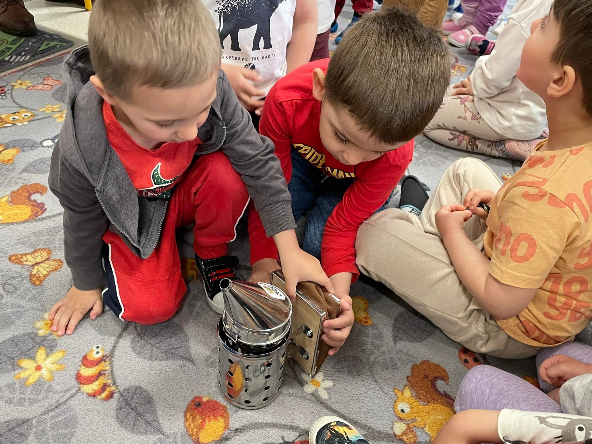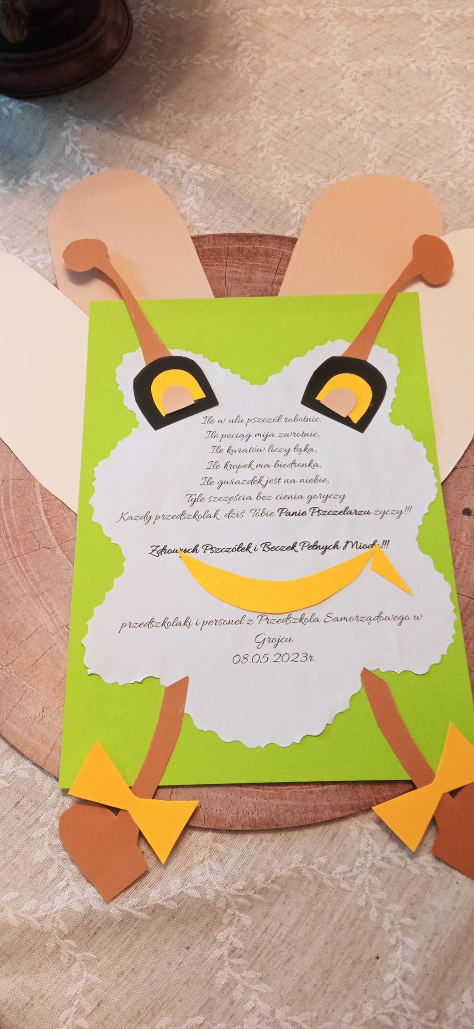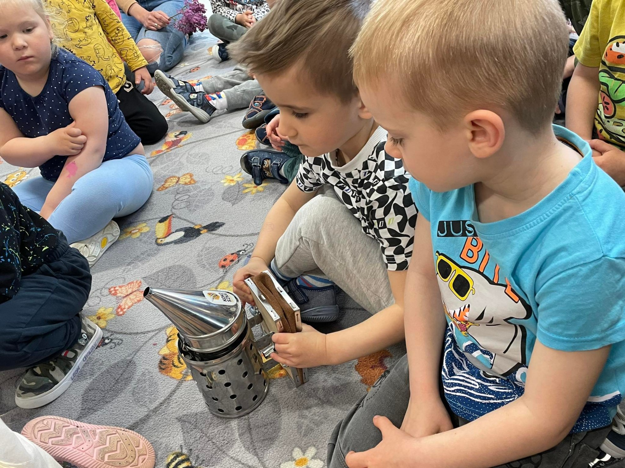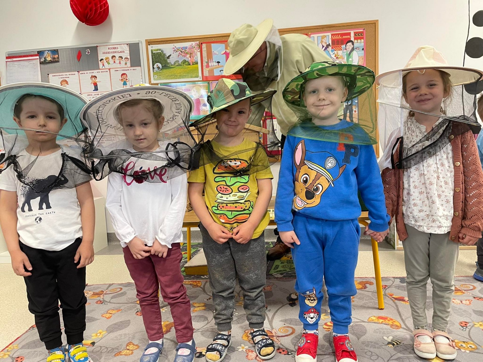 W dniu 8 maja odwiedził nas Pan Rysiu, który jest pszczelarzem i ma własną pasiekę. Opowiedział dzieciom o tym, jak powstaje miód i z czego się go otrzymuje. Opowiadał nam o życiu i zwyczajach pszczół oraz czym się żywią. Dzieci mogły z bliska obserwować plastry miodu, rój pszczół oraz odszukiwały królową. Przedszkolaki mogły także z bliska obejrzeć narzędzia pszczelarza tj. podkurzacz, specjalny kapelusz, dymkę i ramkę. Na zakończenie spotkania dzieci kosztowały andruty z miodem. Dziękujemy serdecznie za miłą wizytę oraz poświęcony czas.