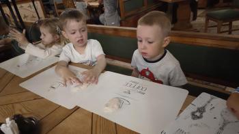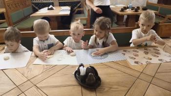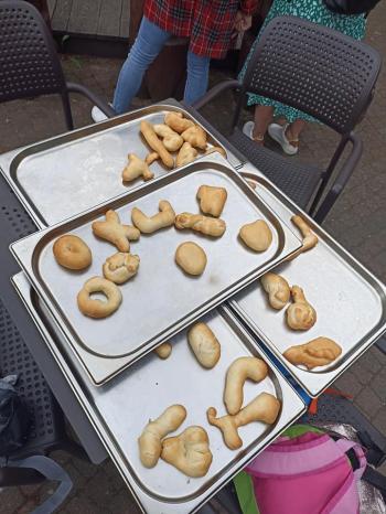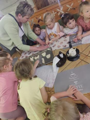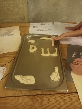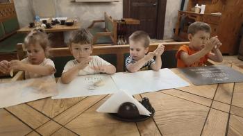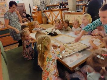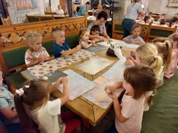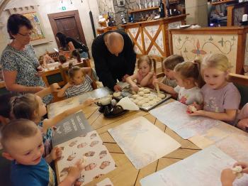 Nasza przygoda w Warowni Pszczyńskich Rycerzy zaczęła się od poznania historii pieczenia chleba. O etapach wypieku chleba i jego znaczeniu dla ludzi w ciekawy sposób opowiadali nam animatorzy. Każdy przedszkolak otrzymał kawałek ciasta, z którego mógł formować swój mały chlebek. Nasze chlebowe dzieła trafiły do specjalnego pieca, które po upieczeniu dzieci zabrały do domu aby pochwalić się rodzicom.