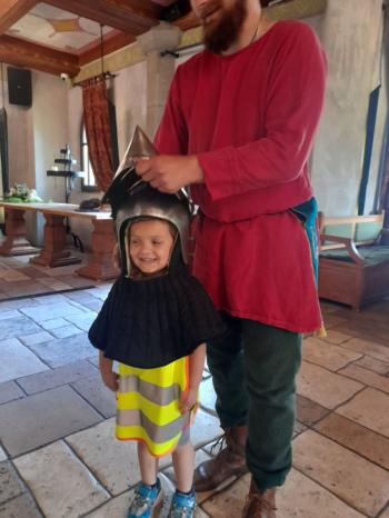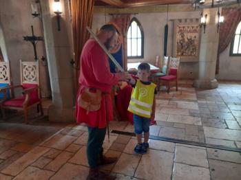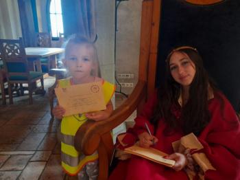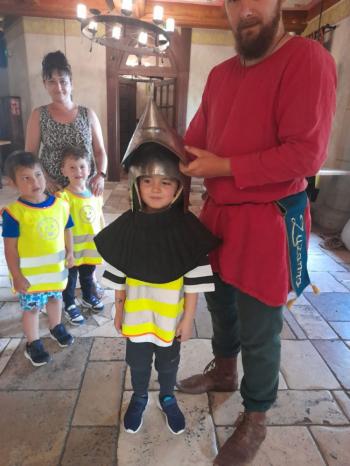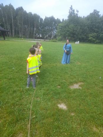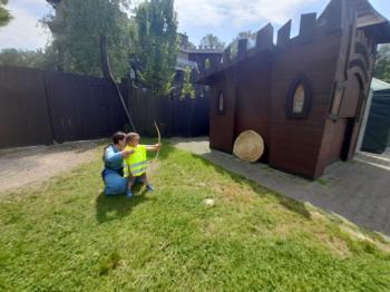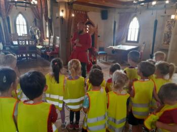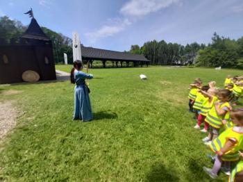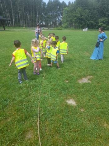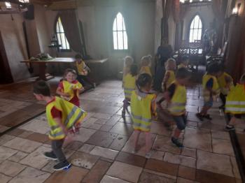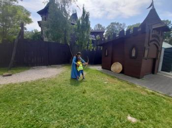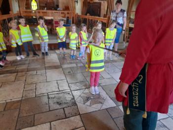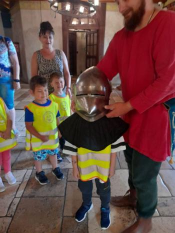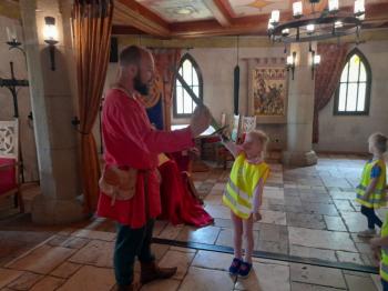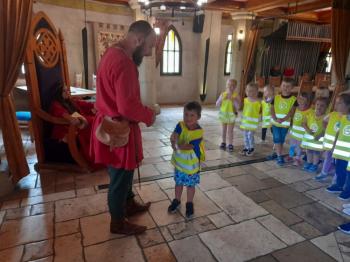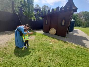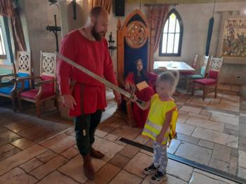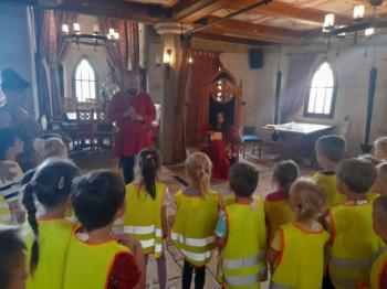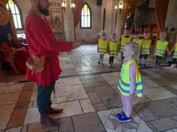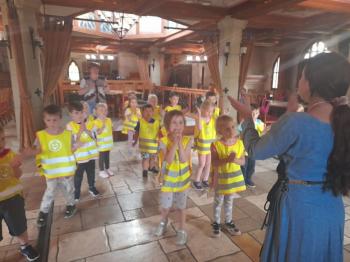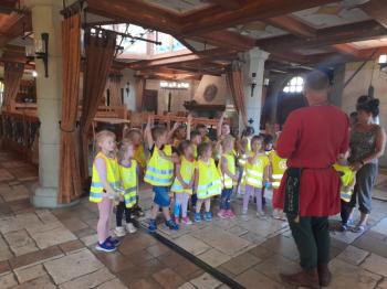 W dniu 5 czerwca przedszkolaki z II oddziału pojechały na wycieczkę do Warowni Pszczyńskich Rycerzy w Pszczynie. Przedszkolaki od samego rana nie mogły się doczekać, kiedy nastąpi chwila, że wyruszą na dzisiejszą przygodę. Kiedy opuściliśmy mury przedszkola, dzieci były przeszczęśliwe. Po przyjeździe na miejsce , przedszkolaków powitała Dwórka Paulina , która zaprosiła nas zwiedzania zamku. Następnie w Sali Rycerskiej zobaczyliśmy jak wygląda miecz oraz chętne dzieci przymierzały hełm rycerski. Po uroczystej przysiędze przedszkolaki zostały pasowane na rycerzy i księżniczki. Następnie uczestniczyliśmy w konkurencjach sprawnościowych jak: pokonanie toru przeszkód, strzelanie z łuku, zabawy na spryt i zwinność przy użyciu liny oraz wielkich poduszek, a na zakończenie Dwórka Paulina nauczyła nas tańca księżniczek i rycerzy. Na koniec oczywiście nie mogło zabraknąć zabaw na świeżym powietrzu. Przedszkolaki uśmiechnięte i radosne wróciły do przedszkola. To był bardzo królewski dzień!!! |