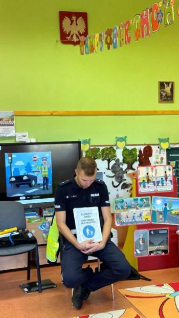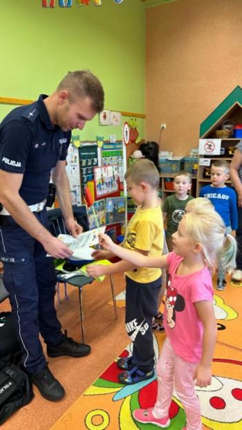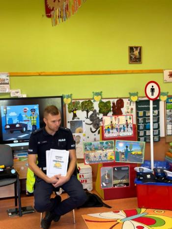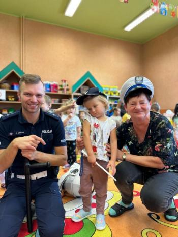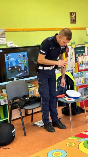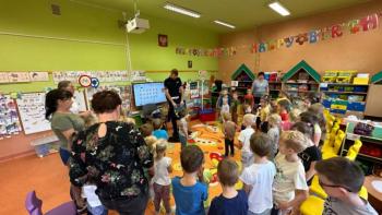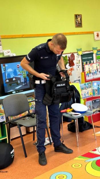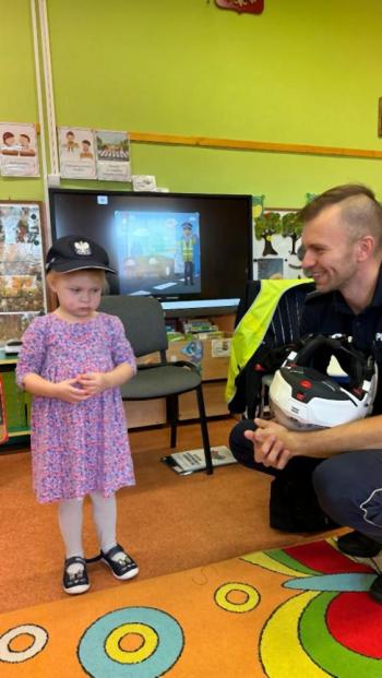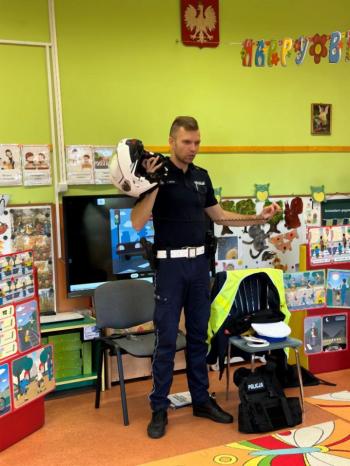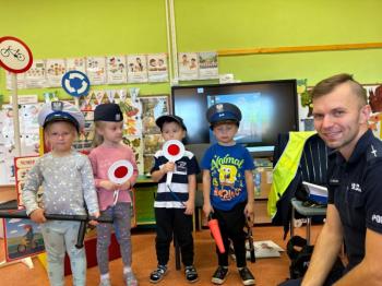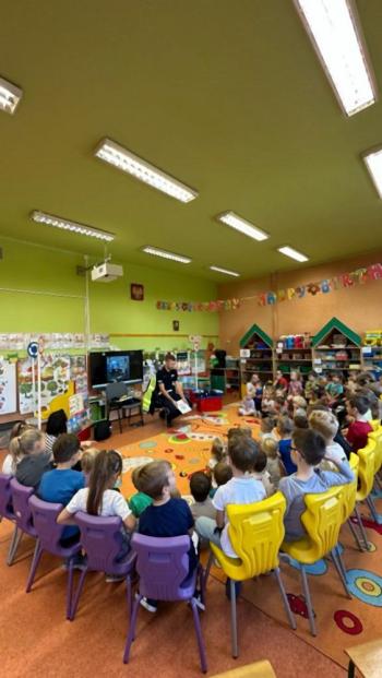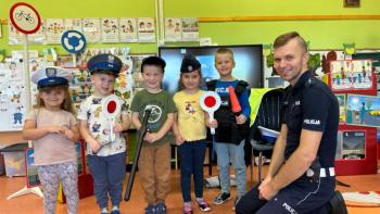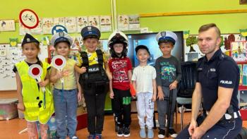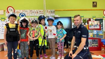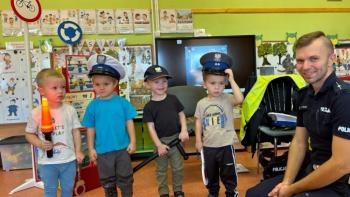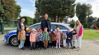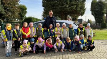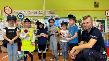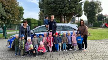 W dniu 24 października nasze przedszkole odwiedził młodszy aspirant Paweł Mrozik – policjant z drogówki. Przypomniał dzieciom zasady ruchu drogowego podczas przechodzenia przez jezdnię, jazdy na rowerze, hulajnodze i samochodem. Ponadto zwrócił uwagę na noszenie przez dzieci i dorosłych odblasków. Pan policjant zapoznał przedszkolaków jak wygląda mundur, czapki policyjne oraz przedmioty potrzebne w pracy jak: sygnalizator ruchu, kamizelki odblaskowe i kuloodporne, kajdanki, alkomat, hełm motocyklisty itp. Na zakończenie spotkania przedszkolaki mogły zobaczyć radiowóz policyjny i jego wyposażenie. Przedszkolaki podziękowały za spotkanie piosenką, dyplomem i upominkiem. To był dzień wielu wrażeń!!! |