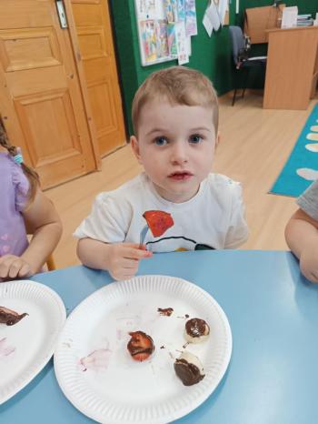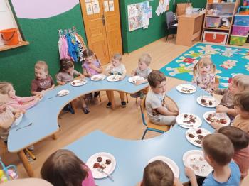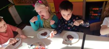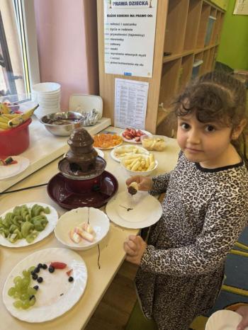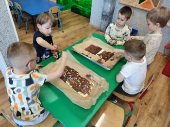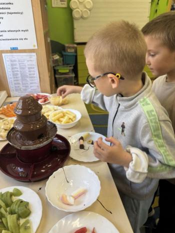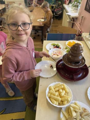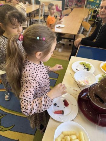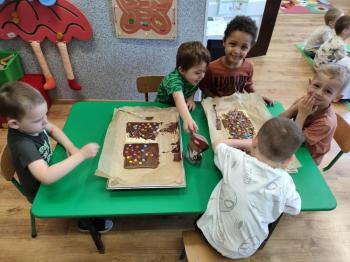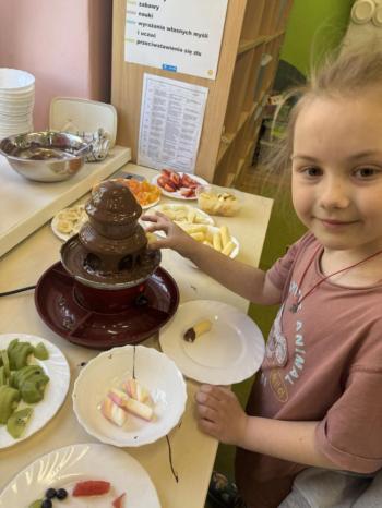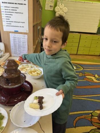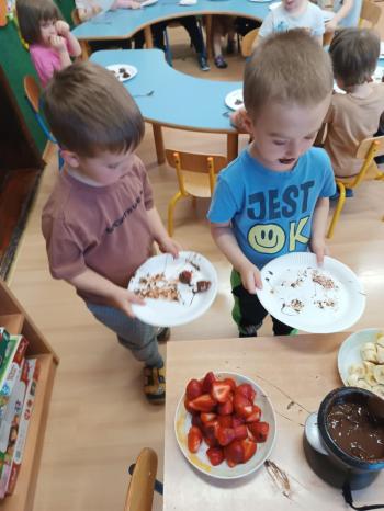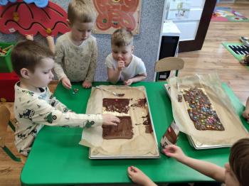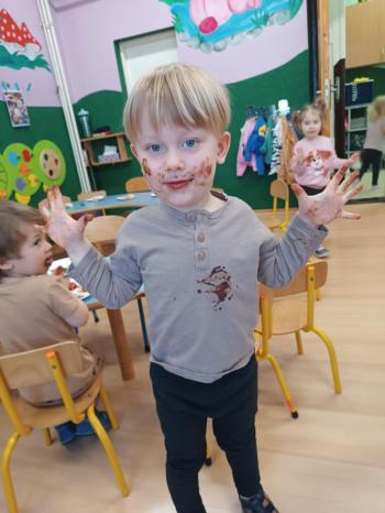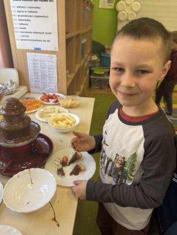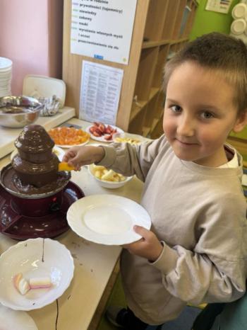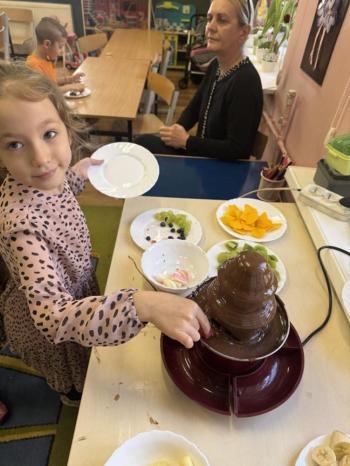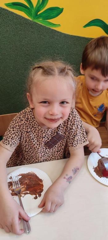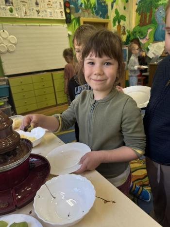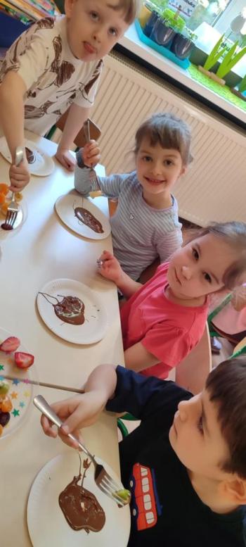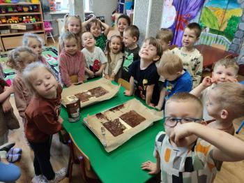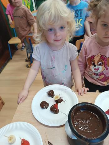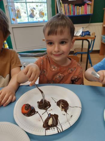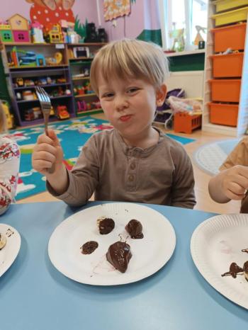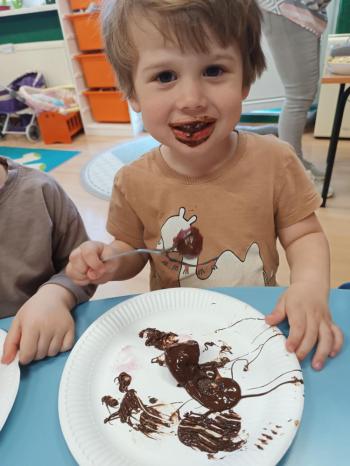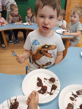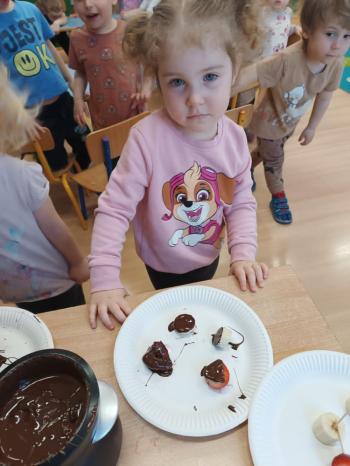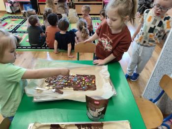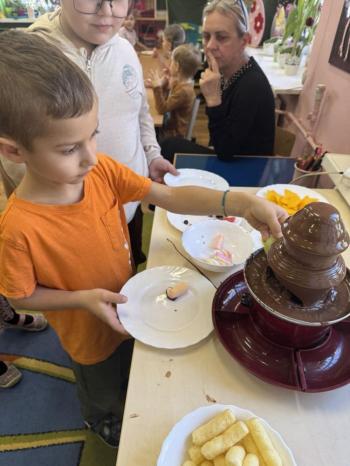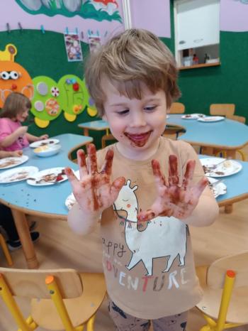 W naszym przedszkolu 14 kwietnia obchodziliśmy Dzień Czekolady – jedno z najsłodszych świąt w kalendarzu! Dzieci poznały historię czekolady, dowiedziały się, skąd pochodzi kakao oraz jak powstają czekoladowe smakołyki. Nie zabrakło również kreatywnych zabaw plastycznych, w których motywem przewodnim była oczywiście… czekolada! W każdej grupie zorganizowano tematyczne zajęcia: degustacje różnych rodzajów czekolady, eksperymenty z rozpuszczaniem tabliczki w ciepłym mleku, a nawet małe warsztaty kulinarne, podczas których dzieci przygotowywały własne słodkie przekąski. Dzień Czekolady był nie tylko pysznym, ale i edukacyjnym przeżyciem – połączyliśmy przyjemne z pożytecznym! Dziękujemy wszystkim dzieciom i nauczycielom za aktywny udział i radosną atmosferę!