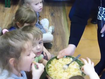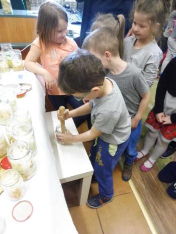 Po tak obszernych wyjaśnieniach przystąpiliśmy do samodzielnego wykonania kiszonki. Praktyczne uwagi p. Marii pozwoliły każdemu dziecku zrobić dla siebie swoją własną kiszoną kapustę. Z jej pomocą okazało się to bardzo łatwe.