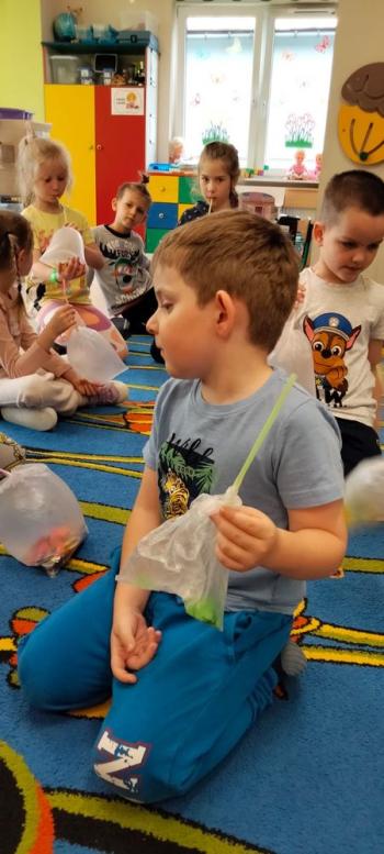 Kolejne zajęcia, w których uczestniczyły ,,Pszczółki” realizujące program Mali Wielcy Odkrywcy odnosiły się do funkcji oddychania. Wszyscy wiemy, że oddychanie jest konieczne do życia, a narządem służącym do oddychania są płuca. Dlatego dzieci poznały ich budowę i sposób działania, a następnie tworzyły zabawkę oddechową, która zobrazowała pracę płuc. Malowanie powietrzem pozwoliło na stworzenie prac plastycznych o różnorodnej tematyce i kolorystyce.