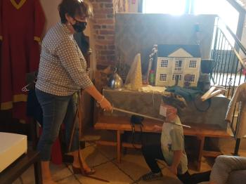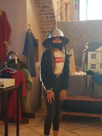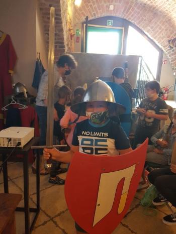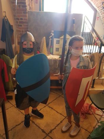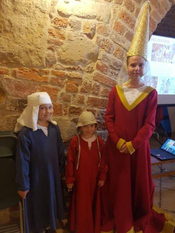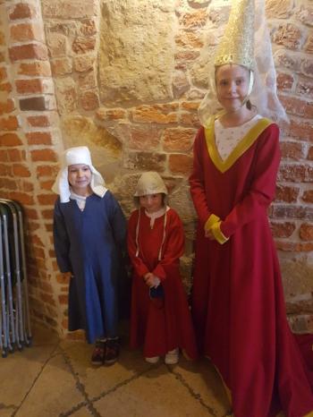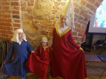 Podczas pierwszej wizyty zwiedzaliśmy wnętrza zamku oraz wieży. Natomiast bezpośrednio po zakończeniu zwiedzania dzieci wzięły udział w warsztatach edukacyjno-plastycznych dotyczących dawnych czasów, kiedy to żyły piękne białogłowy i dzielni rycerze. Chłopcy przebierali się w zbroje rycerzy, a dziewczęta w stroje królewien, mieszczek czy wieśniaczek. W części plastycznej spotkania chłopcy samodzielnie wykonywali tarcze i przyłbice rycerskie, a dziewczęta piękne korony.