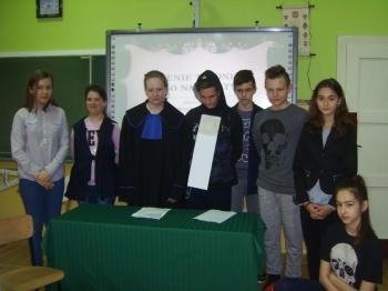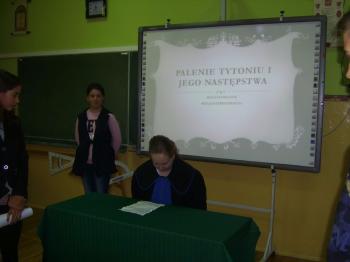 Członkowie Szkolnego Kola PCK przygotowali dla uczniów klasy piątej rozprawę sądową, której bohaterem był oskarżony papieros. Po wysłuchaniu aktu oskarżenia, świadkowie odpowiadali na pytania sądu. Lekarz, kosmetyczka, dziecko nałogowej palaczki jeszcze bardziej pogrążyli oskarżonego. Jego obrońca nie miał wiele do powiedzenia. Wyrok sądu był jednoznaczny. Papierosowi dożywotnio zakazano wychodzenia z paki. Następnie głos zabrała higienistka szkolna Pani Renata Hałatek, która jeszcze raz opowiedziała o szkodliwości tytoniu .Pogadance towarzyszyła prezentacja, która z pewnością na długo pozostanie w pamięci uczniów.