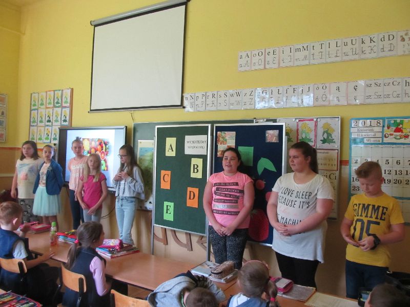 26 kwietnia 2018r. w klasie pierwszej zawitały ,,Witaminki”. Uczniowie klasy 5 przygotowali krótkie przedstawienie o znaczeniu witamin w życiu dziecka, pani higienistka uzupełniając komentarzami prezentacje, przypomniała pierwszakom o zdrowym odżywianiu. W wyczerpujący i jasny sposób odpowiadała na pytania uczniów. Podsumowaniem tematu był film pt „Kubuś Puchatek i witaminy”.