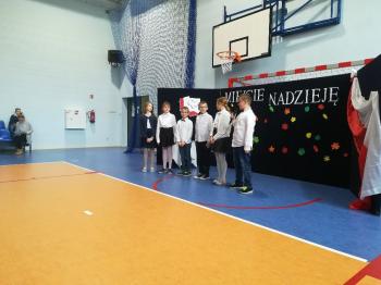 Uczniowie klasy Vb przygotowali ciekawą prezentację, podczas której tworzona była również dekoracja, odśpiewali „Rotę”, wyrecytowali piękne wiersze. Piosenki „Niepodległa niepokorna” zaśpiewana przez Wiktorię Salamon oraz „Miejcie nadzieję” w wykonaniu Igi Żółtowskiej i Martyny Cinalskiej spotkały się dużym zainteresowaniem wszystkich uczniów. Następnie wszyscy uczniowie i nauczyciele naszej szkoły odśpiewali 4 zwrotki „Mazurka Dąbrowskiego” jednocześnie włączając się w akcję „Szkoła do hymnu”.