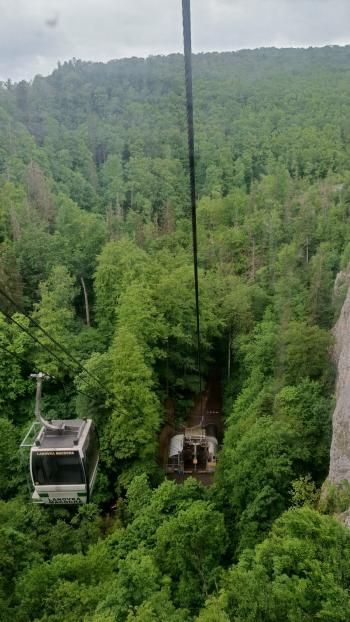 Po wyjściu z jaskini ruszyliśmy kolejką linową nad Przepaść Macochy – najgłębszy lej krasowy w Czechach. Widok z góry był oszałamiający i na długo zostanie w naszej pamięci. To miejsce to prawdziwy cud natury!