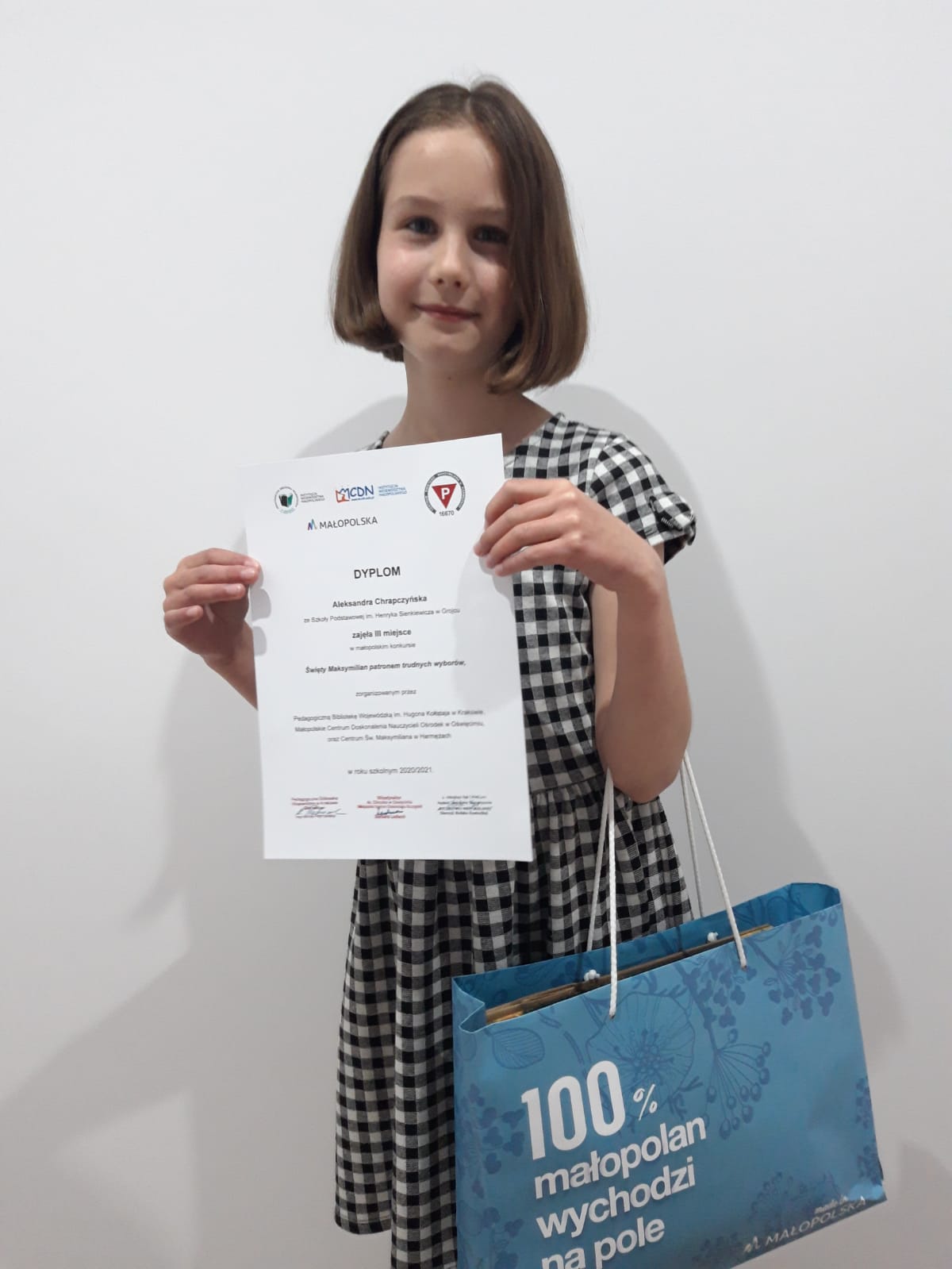 Uczennica klasy IIIa Aleksandra Chrapczyńska zajęła III miejsce w wojewódzkim konkursie plastycznym „Święty Maksymilian patronem trudnych wyborów”.