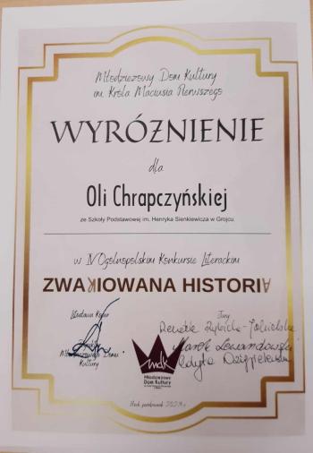 Ola Chrapczyńska zdobyła wyróżnienie w IV Ogólnopolskim Konkursie Literackim "Zwariowana historia".