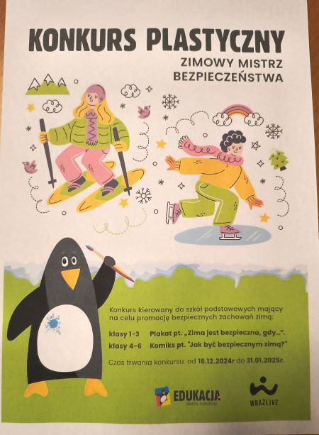 Zadaniem uczniów klas 4-6 jest stworzenie komiksu o przygodach Pingwina – “Jak być bezpiecznym zimą?” Uczniowie mają stworzyć krótką historię obrazkową (komiks), w której bohaterem jest Pingwin uczący innych, jak bezpiecznie spędzać czas zimą. Technika wykonania pracy to dowolna forma komiksowa - ołówek, kredki, cienkopis itp..