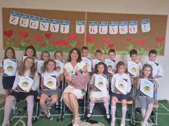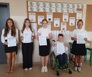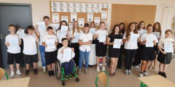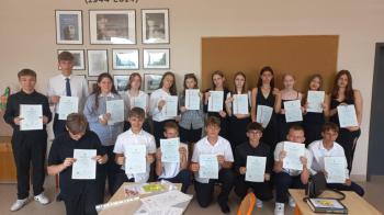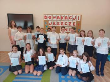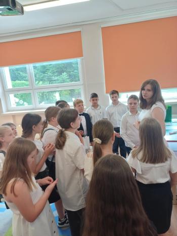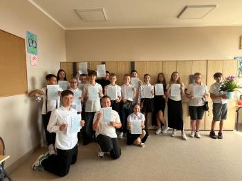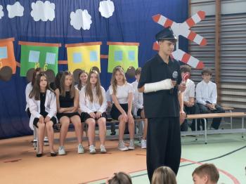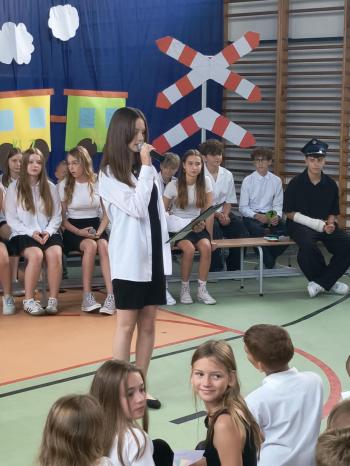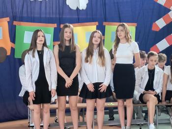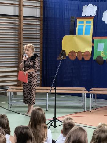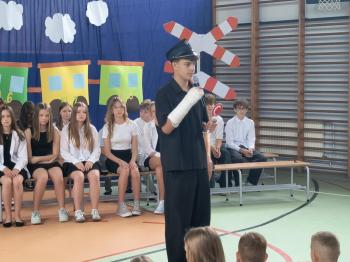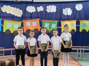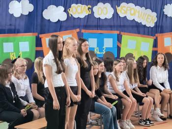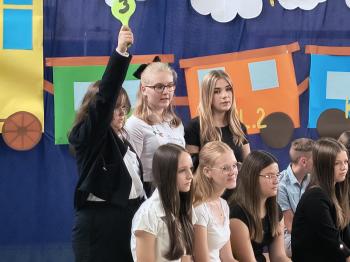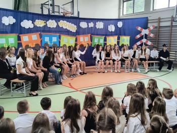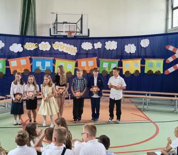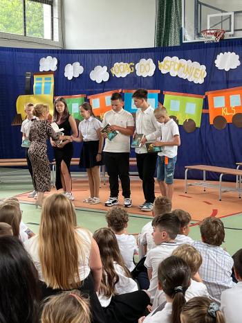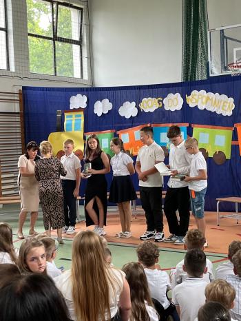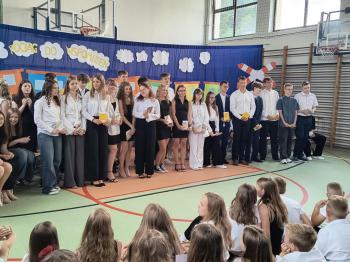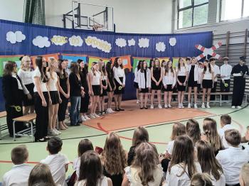 Po części oficjalnej przyszedł czas na program pożegnalny- klasy siódme żegnały absolwentów naszej szkoły. Na tę okoliczność przygotowały program zatytułowany "Pociąg do wspomnień", w którym, inspirując się wierszem "Lokomotywa" Juliana Tuwima, porównały naukę w szkole podstawowej do podróży pociągiem, a zdobyte doświadczenia symbolicznie umieściły w ośmiu wagonikach. Klasy siódme przygotowały również drobne prezenty w postaci zdjęć i koniczynek na szczęście, które wręczyły wzruszonym absolwentom i ich wychowawcom. Potem wszyscy uczniowie ruszyli do klas na ostatnie w tym roku spotkanie z wychowawcami. Wszystkim życzymy udanych i bezpiecznych wakacji, a absolwentom wysokich wyników egzaminów i dostania się do wymarzonych szkół ponadpodstawowych.