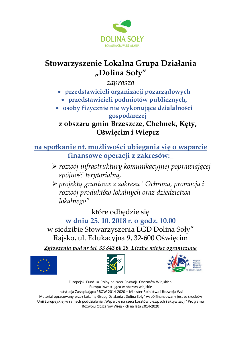 LGD Dolina Soły zaprasza na spotkanie informacyjne nt. możliwości ubiegania się o wsparcie finansowe operacji z zakresu rozwoju infrastruktury komunikacyjnej poprawiającej spójność terytorialną oraz na projekty grantowe z zakresu: "Ochrona, promocja i rozwój produktów lokalnych oraz dziedzictwa lokalnego". Spotkanie odbędzie się 25.10.2018 r. o godz.10.00 w siedzibie Stowarzyszenia LGD Dolina Soły, Rajsko ul. Edukacyjna 9.