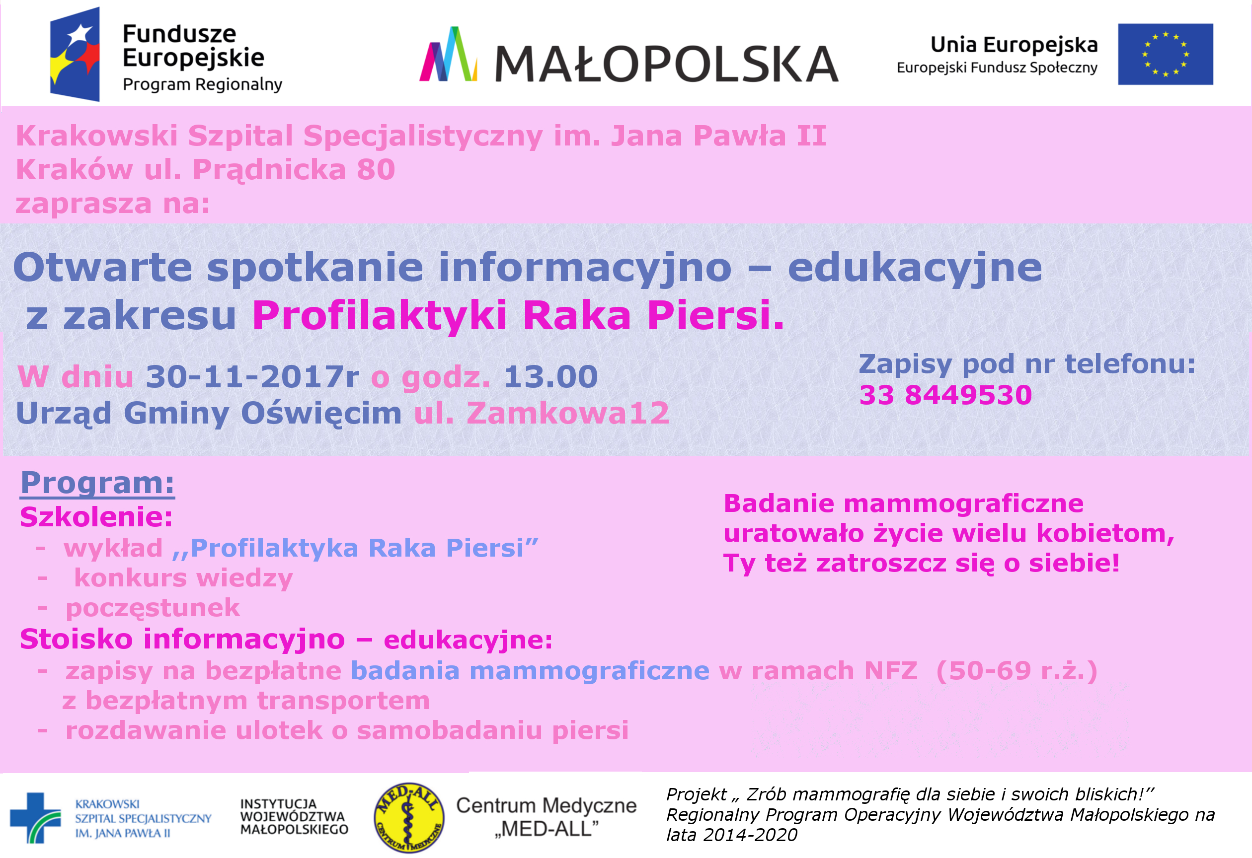 Zapraszamy do wzięcia udziału w spotkaniu profilaktyczno-edukacyjnym "Profilaktyka Raka Piersi" organizowanym przez Krakowski Szpital Specjalistyczny im. Jana Pawła II w Krakowie. Spotkanie odbędzie się 30.11.2017 roku, o godzinie 13.00 w Urzędzie Gminy Oświęcim (sala sesyjna). Szczegóły na plakatach.