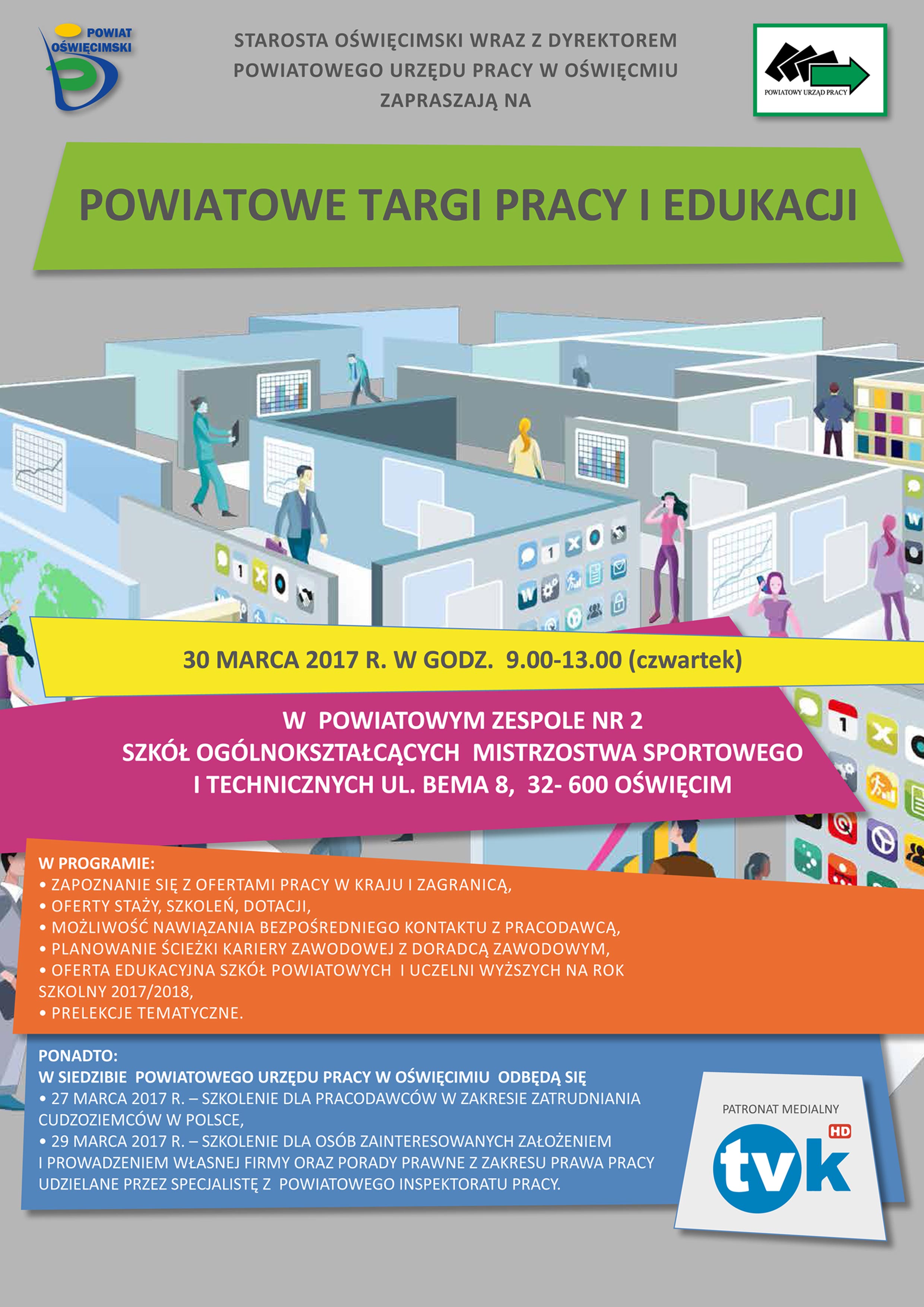 Starosta Oświęcimski wraz z Dyrektorem Urzędu Pracy w Oświęcimiu zapraszają na Powiatowe Targi Pracy i Edukacji, które odbędą się 30 marca 2017 roku (czwartek), w godzinach 9.00 - 13.00 w Powiatowym Zespole nr 2 Szkół Ogólnokształcących Mistrzostwa Sportowego i Technicznych, ul. Bema 8, 32-600 Oświęcim.
