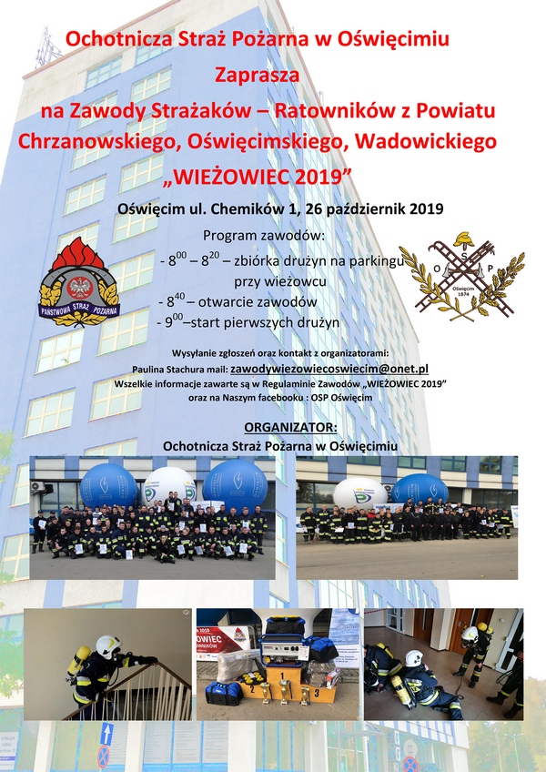 Ochotnicza Straż Pożarna w Oświęcimiu zaprasza na zawody strażaków-ratowników z powiatów: chrzanowskiego, oświęcimskiego i wadowickiego. Zawody "Wieżowiec 2019" rozpoczną się 26 października o godz. 9.00 w Oświęcimiu, przy ul. Chemików 1.