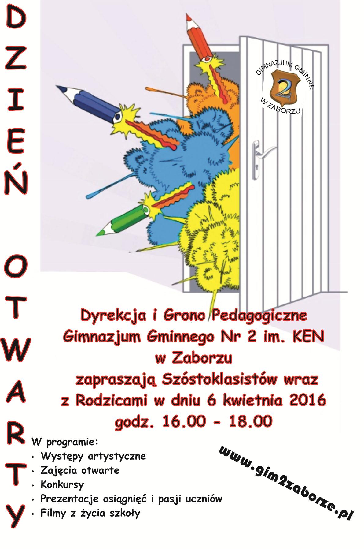 Dyrekcja i Grono Pedagogiczne Gimnazjum Gminnego nr 2 w Zaborzu zaprasza w najbliższą środę 6 kwietnia w godzinach 16.00 -18.00 na Dzień Otwarty. Zainteresowani szóstoklasiści i ich rodzice z gminy i miasta Oświęcim będą mieli możliwość zapoznania się z ofertą edukacyjną naszej szkoły na nowy rok szkolny, zwiedzenia pracowni klasowych, rozmowy z dyrekcją, nauczycielami i uczniami ...