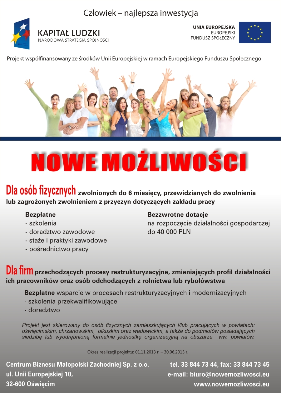 Centrum Biznesu Małopolski Zachodniej Sp. z o.o. rozpoczyna realizację nowego projektu pn. „Nowe możliwości”, dofinansowanego ze środków Unii Europejskiej w ramach Europejskiego Funduszu Społecznego, Działanie 8.1.2 Wsparcie procesów adaptacyjnych i modernizacyjnych w regionie ...