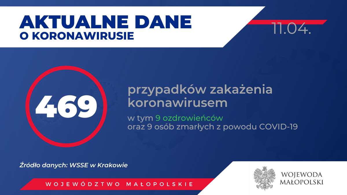 Obecnie w Małopolsce zakażenie koronawirusem zostało potwierdzone u 469 osób (stan na 11 kwietnia, godziny przedpołudniowe).