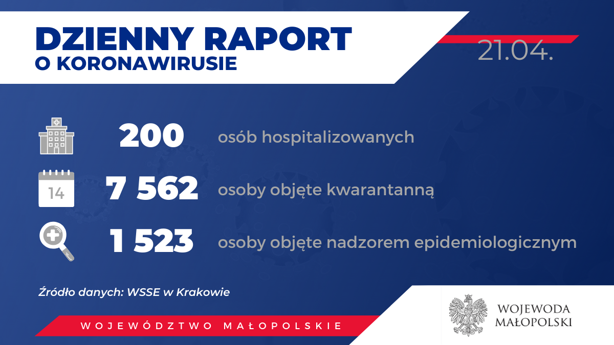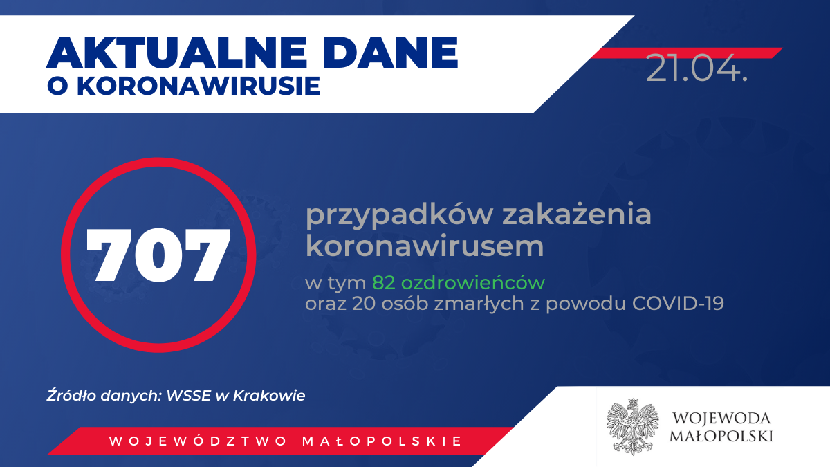 Obecnie w Małopolsce zakażenie koronawirusem zostało potwierdzone u 707 osób (stan na 21 kwietnia, godziny popołudniowe). Wśród potwierdzonych 21 kwietnia nowych przypadków nie ma mieszkańców powiatu oświęcimskiego.