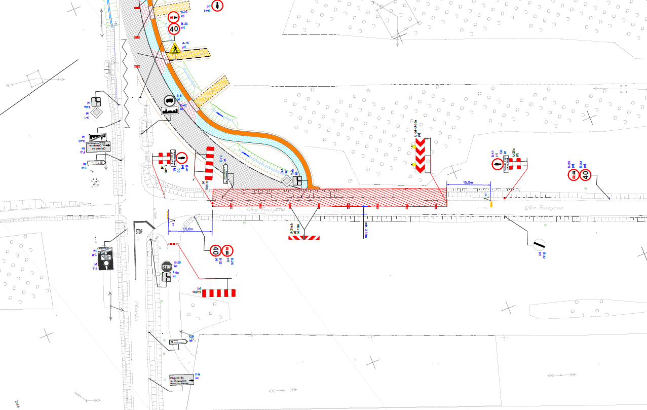 Wykonawca zadania budowy obwodnicy Oświęcimia- firma Budimex S.A., informuje, że w dniu 09.04.2024 r. (wtorek) o godzinie 11:00 zostanie wdrożona tymczasowa organizacja ruchu związana przebudową ul. Pławskiej i ul. Ofiar Faszyzmu w Brzezince. Utrudnienia polegać będą na zamknięciu jednego pasa ruchu ul. Ofiar Faszyzmu (strona zachodnia) i wprowadzenie sygnalizacji wahadłowej (długość wahadła 110m), według poniższego schematu.
